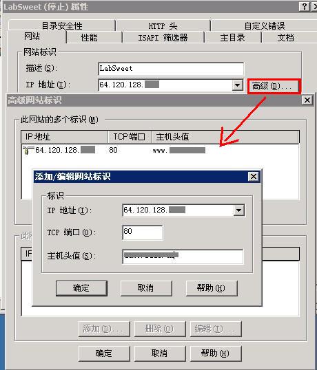 7、在“网络”标签中点击“高级”,则出现了刚才添加的主机头,如果你有二级域名需要添加可在此处完善设置。